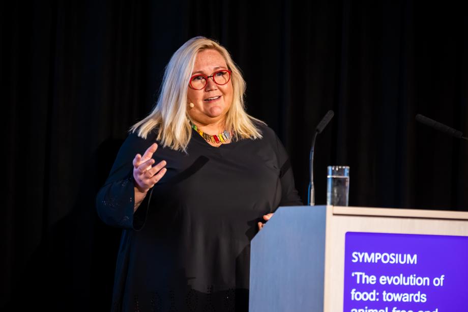 Foto hieronder: Ira Van Eelen aan het woord tijdens het internationaal symposium 'The evolution of food: towards animal-free and sustainable technology', georganiseerd in Brussel op 25 april 2022 door GAIA en Eurogroup for Animals.